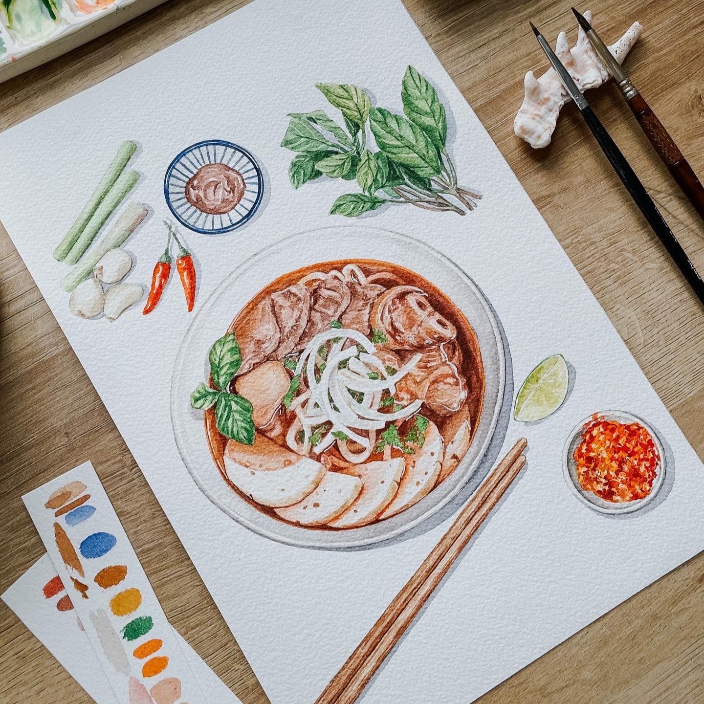 I’m a Vietnamese artist now based in the U.S., and my passion lies in blending my love for food with watercolor art. My food designs have gained quite a following, transforming recipes into beautiful watercolor masterpieces. What started as a hobby during the pandemic soon turned into a flourishing creative career. With extra time at home, I found joy in drawing, which led to significant growth on social media. I truly value the flexibility and freedom in my work, and I’ve been drawn to watercolor for its simplicity and minimal investment. Through my art, I aim to tell stories with intricate details, celebrating the rich culinary culture of Vietnam that means so much to me.